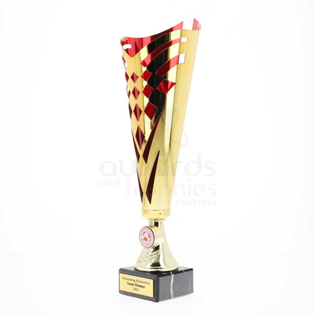Discover the Riviera Cup series, a versatile choice available in five sizes: 330mm, 350mm, 380mm, 390mm, and 430mm. With 14 colour options, this trophy features a gold cup with diamond cutouts and a striking red interior, all set on a marble base. Add personalisation to honour accomplishments with style and sophistication.