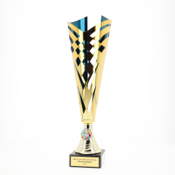 Discover the versatile Riviera Cup series, available in five sizes ranging from 330mm to 430mm, and choose from 14 colour variations. This trophy features a sophisticated design with diamond cutouts on a gold cup, complemented by a striking blue interior and set on a marble base. Personalise your cup to commemorate achievements with style and grace.